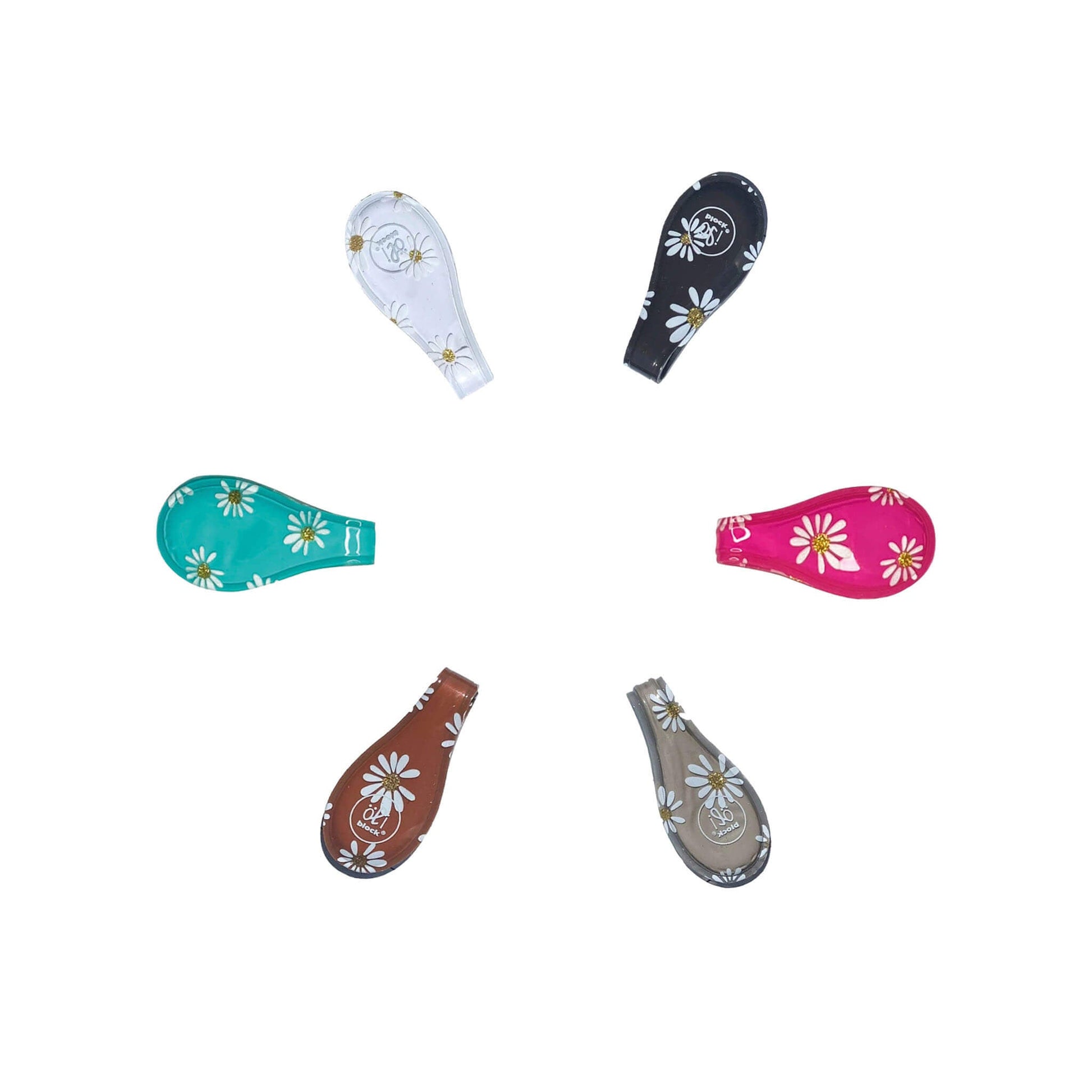 Super-charged magnetic clip featuring a bright teal and white daisy design with gold glitter. This clip is part of the PETAL collection and comes in a range of colours.